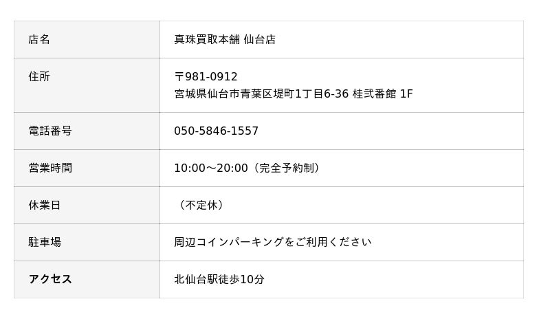 ※「東北内の真珠買取専門店」に関する当社調べ(2025年12月/宮城県・山形県・岩手県・秋田県周辺の主要買取店・宝飾店を対象)によるものです。