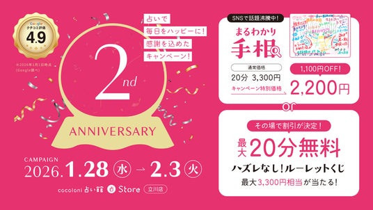 ザッパラスグループの株式会社cocoloni(本社:東京都渋谷区、代表取締役:溝上雅俊)が運営する占いの店『cocoloni占い館』立川店が、2026年1月28日(水)に2周年を迎えました。それを記念して2026年1月28日(水)より2周年キャンペーンを開催いたします。