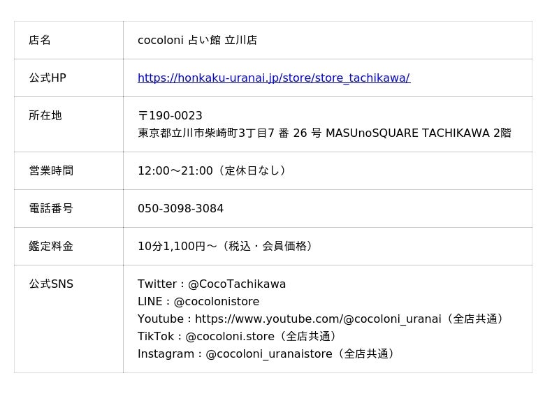 占いの店『cocoloni占い館』は、cocoloniのサービスとしては初のリアル店舗として2024年1月28日に東京・立川に1号店を出店。続く、2024年5月には埼玉・川越に2号店をオープン。「占い=怪しい」を「占い=楽しい」へ!という思いのもと、安心・安全・高クオリティな占いをお届けする一つの拠点として、現在の占いへのニーズや現代人のライフスタイルに合った占いの店を目指し、親しみやすい店舗設計や空間づくり、サービス提供を行っております。また、鑑定料金は事前決済で10分1,100円~(会員価格)とし、予約無しで「気軽にぷらっと占い」をコンセプトに店舗を拡大中です。西洋占星術、四柱推命、タロットカード、ルノルマンカードなど、多彩な占術をもった占い師が所属し、対面ならではの臨場感あふれる占いを体験いただけます。