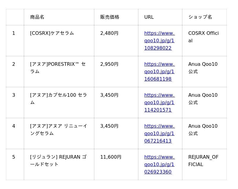 Qoo10(https://www.qoo10.jp/)サイト上、「美容液」「リップメイク」「アイシャドウ」「チーク」カテゴリーの公式ショップ各販売個数に基づいたランキングです。
