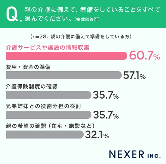 最も多かったのは「介護サービスや施設の情報収集」で60.7%でした。次に「費用、資金の準備」が57.1%、「介護保険制度の確認」と「兄弟姉妹との役割分担の検討」がそれぞれ35.7%、「親の希望の確認(在宅、施設など)」が32.1%でした。