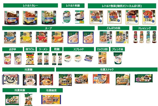 からだシフト「糖質コントロール」シリーズ(常温)は、ごはんや麺のような主食はもちろん、カレーや丼の具などのおかず、小腹を満たせるスープ類、ドレッシングなど、全33SKU、「糖質コントロール」シリーズ(低温)は全12SKUを用意しています。