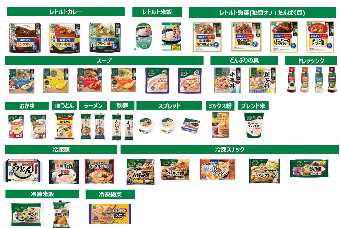 からだシフト「糖質コントロール」シリーズ(常温)は、ごはんや麺のような主食はもちろん、カレーや丼の具などのおかず、小腹を満たせるスープ類、ドレッシングなど、全33SKU、「糖質コントロール」シリーズ(低温)は全12SKUを用意しています。