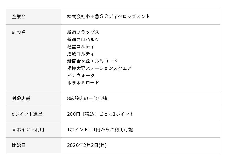 株式会社NTTドコモ(以下、ドコモ)は、ドコモが提供するポイントサービスdポイントが、2026 年2月2日(月)から小田急の大型ショッピングセンター8施設の対象店舗(※1)でご利用可能になることを記念して、通常の20倍のdポイント(期間・用途限定)(※2)を進呈する「小田急のショッピングセンターdポイントスタート記念!もれなく20倍キャンペーン」(以下、本キャンペーン)を2026年2月16日(月)から3月15日(日)までの期間で開催(※3)いたします。本キャンペーンの事前エントリーは2026年2月2日(月)から開始いたします。