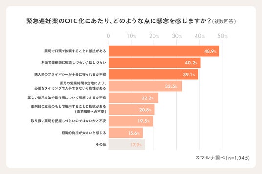 – 懸念内容は、1位:薬局で口頭で依頼することに抵抗がある(48.9%)、2位:対面で薬剤師に相談しづらい/話しづらい(40.2%)、3位:購入時のプライバシーが十分に守られるか不安(39.1%)