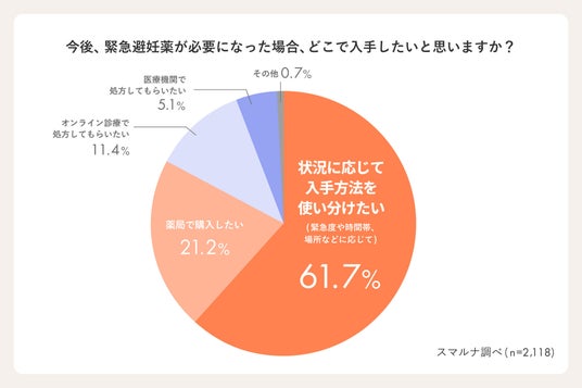 続いて、今後緊急避妊薬が必要になった場合の入手先について尋ねたところ、「状況に応じて入手方法を使い分けたい(緊急度や時間帯、場所など)」が最多でした。OTC化によって薬局での購入という選択肢が加わることで、状況に応じた入手方法を選びやすくなることが期待されます。