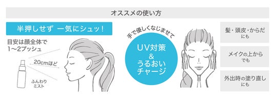 ●肌から20cmくらいはなし、目・口を閉じて顔全体にスプレーし、手で優しくなじませてください。(顔全体で1~2回プッシュが目安です。半押しせず押し切ることで、より細かなミストを実感いただけます。)●初めてお使いいただく時や長時間ご使用を中止されていた後は、手のひらなどに数回プッシュし、中身がスムーズに出ることを確認してからお使いください。●使用量が少ないと、紫外線防止効果が得られにくくなります。効果を保つためにも十分な量をムラなく塗り、タオルでふいたり泳いだりした後は、必ず塗り直してください。商品のSPF表示及びPA表示は、国際的に定められている標準塗布量に従い1cm2あたり2mgを皮フに塗布して測定した結果です。●落とすときはスポンジやタオル等を使い、せっけん等の洗浄料をよく泡立てて、ていねいに洗い流してください。メイクをした場合は、メイク落とし等のご使用をおすすめします。