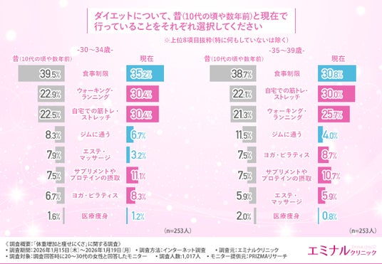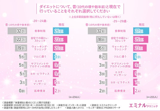 また、『ジムに通う』の割合が減り、自宅でのケアが増えている点からは、多忙な生活の中で「スキマ時間を活用した効率的なダイエット」を模索している現代女性の実態が反映されているといえるでしょう。