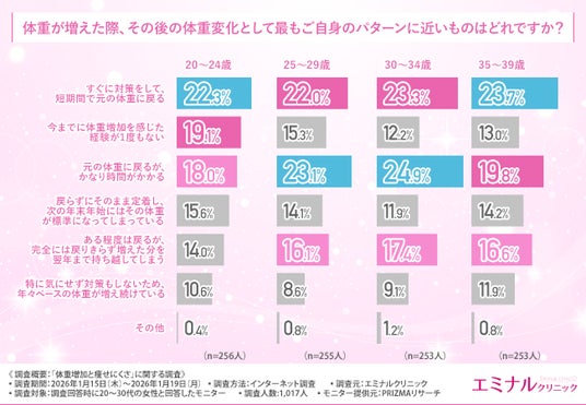 そこで「体重が増えた際、その後の体重変化として最もご自身のパターンに近いものはどれですか?」と質問したところ、年代別で以下のような回答結果になりました。