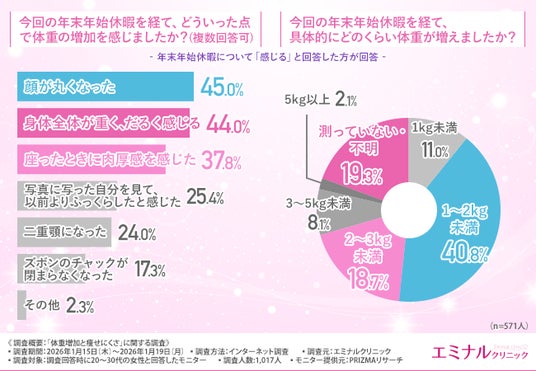 「今回の年末年始休暇を経て、どういった点で体重の増加を感じましたか?(複数回答可)」と質問したところ、『顔が丸くなった(45.0%)』と回答した方が最も多く、『身体全体が重く、だるく感じる(44.0%)』『座ったときに肉厚感を感じた(37.8%)』となりました。