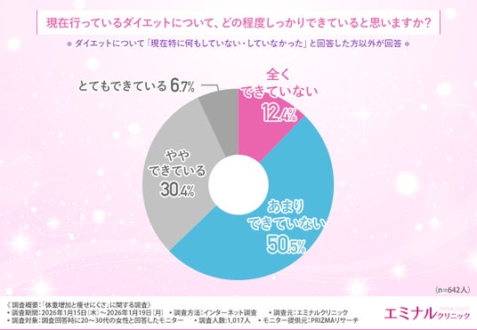 そこで、現在ダイエットを行っている方に「現在行っているダイエットについて、どの程度しっかりできていると思いますか?」と質問したところ、約6割が『全くできていない(12.4%)』『あまりできていない(50.5%)』と回答しました。