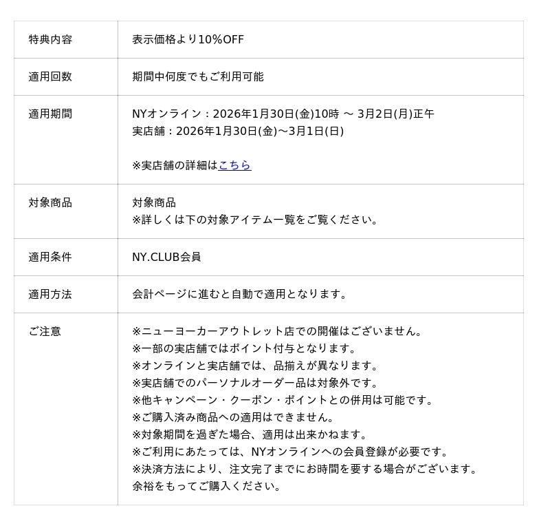 『NY.CLUB』は、公式オンラインストア「NYオンライン」、全国のニューヨーカー、ニューヨーカーアウトレット、アトラエルの店舗でご利用いただける会員プログラムです。