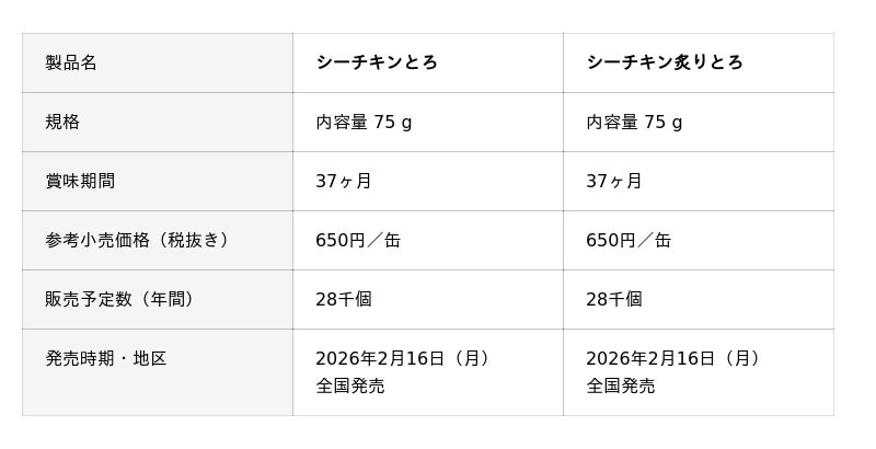 今回のリニューアルでは、ツナの最高級原料と言われる「びんながまぐろ」のとろ肉を、クセの少ない米油と調味液で素材の味を存分に楽しめる味付けに仕上げました。しっとりやわらかなとろ肉を存分に味わえる「シーチキンとろ」と、表面を炙って香ばしさをプラスした「シーチキン炙りとろ」の2種類を発売します。とろ肉の脂のりによって食感や舌触りに差が出ないように製造工程を見直し、より安定した品質とおいしさをお届けします。