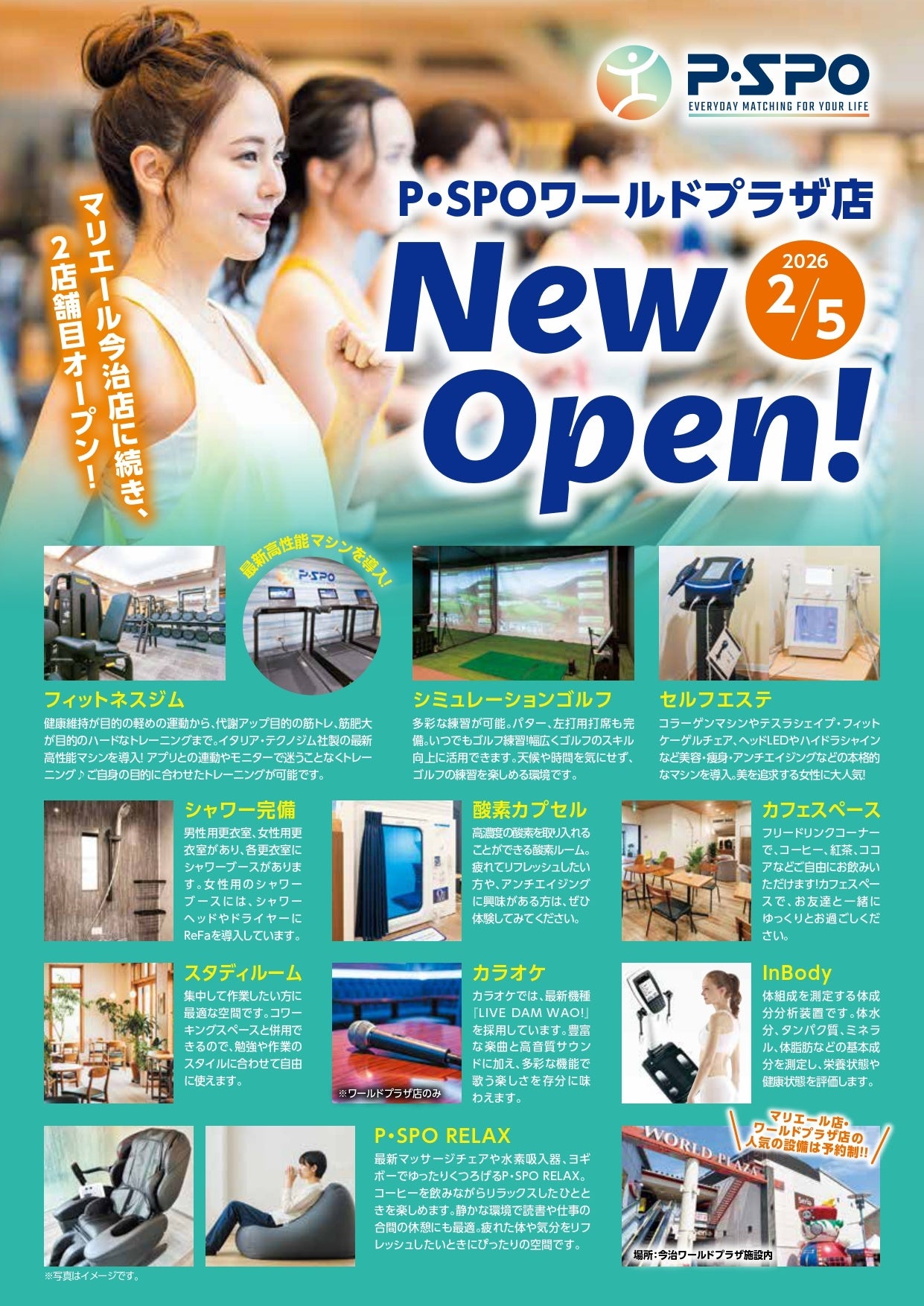 P・SPO(ピースポ)は、愛媛県今治市の商業施設「今治ワールドプラザ」内に、P・SPO ワールドプラザ店を2026年2月5日(木)にグランドオープンします。