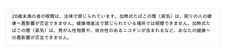 BATグループでは、たばこ製品のマーケティングを適切に実施するために国際的な自主規準を設定しています。そのため消費者に対するたばこ製品に関するすべてのコミュニケーションには、20歳未満の方へのコミュニケーションをお控えいただくとともに、「喫煙と健康に関する注意文言」を表示することを関係各位にお願いしております。加熱式たばこに関しては、記事掲載していただく際には、「健康に関する注意文言」が表示されるようご配慮いただきたく存じます。ご協力の程、何卒よろしくお願い申し上げます。