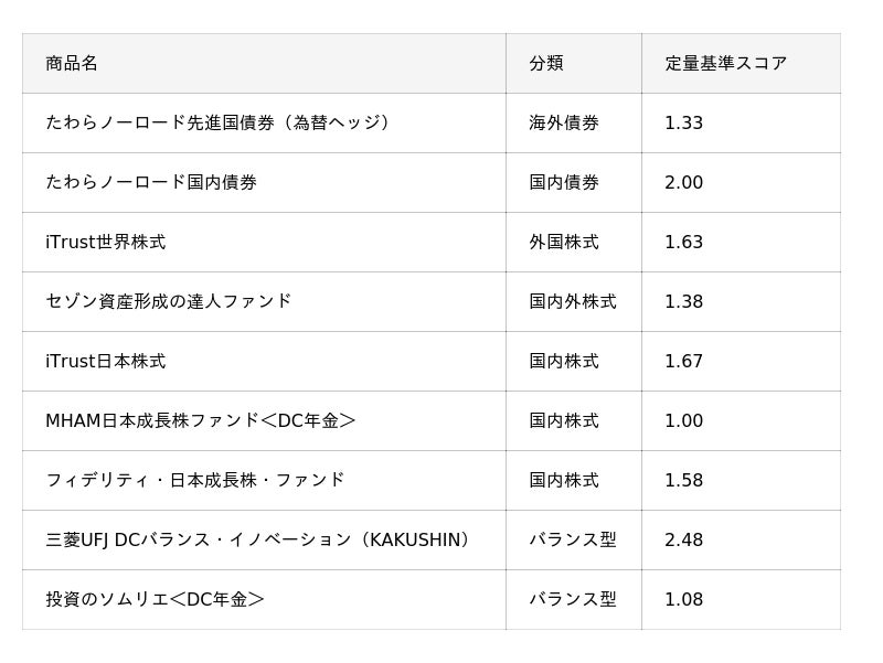年次モニタリングの結果、定量基準スコアが2.5未満の投資信託を対象商品として選定