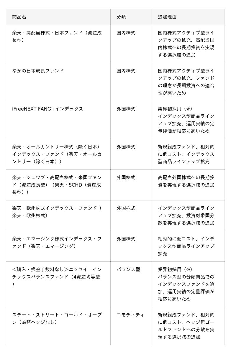 楽天証券株式会社(本社:東京都港区、代表取締役社長:楠 雄治、以下「楽天証券」)は、iDeCo(個人型確定拠出年金、以下「iDeCo」)での長期的な資産づくりニーズにあわせた運用の選択肢を拡げるため、取扱商品ラインアップを見直し、9本の投資信託を、入れ替える(除外・追加)ことをお知らせします。なお、除外対象の商品は、2026年4月1日(水)に新規買付を停止しますが、継続した保有・運用は可能です。