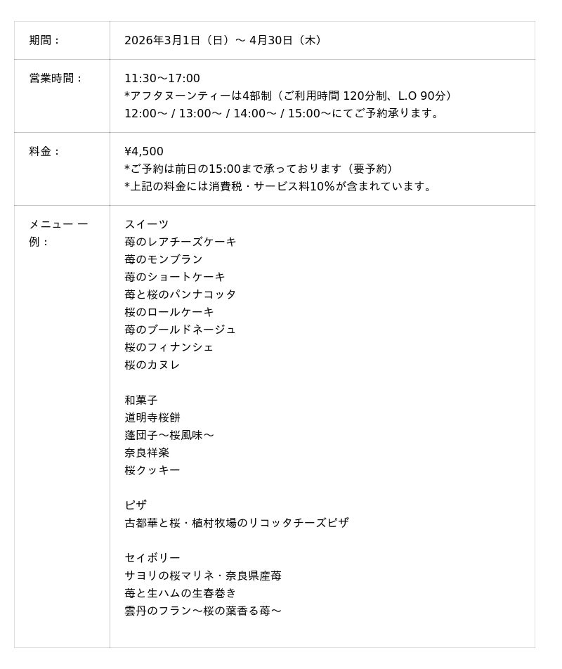 奈良が誇るブランド苺「古都華(ことか)」を主役に、桜の香りをまとったスイーツや和菓子、さらにセイボリーやアフタヌーンティー限定ピザまで、春ならではの味わいを多彩にご用意。
