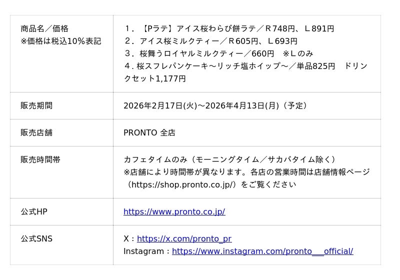 株式会社プロントコーポレーション(本社:東京都港区、代表取締役社長:杉山和弘)は、飲食チェーン『PRONTO(プロント)』のカフェタイム(モーニング/サカバタイム除く)にて、「アイス桜わらび餅ラテ」を含む春限定ドリンク3種を、2026年2月17日(火)より発売いたします。あわせて、「桜スフレパンケーキ~リッチ塩ホイップ~」も同日より発売します。
