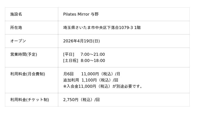 コナミスポーツ株式会社(以下、「弊社」)は、天井にミラーを設置したマシンピラティススタジオ「Pilates Mirror 与野(埼玉県さいたま市)」を2026年4月19日(日)にオープンします。