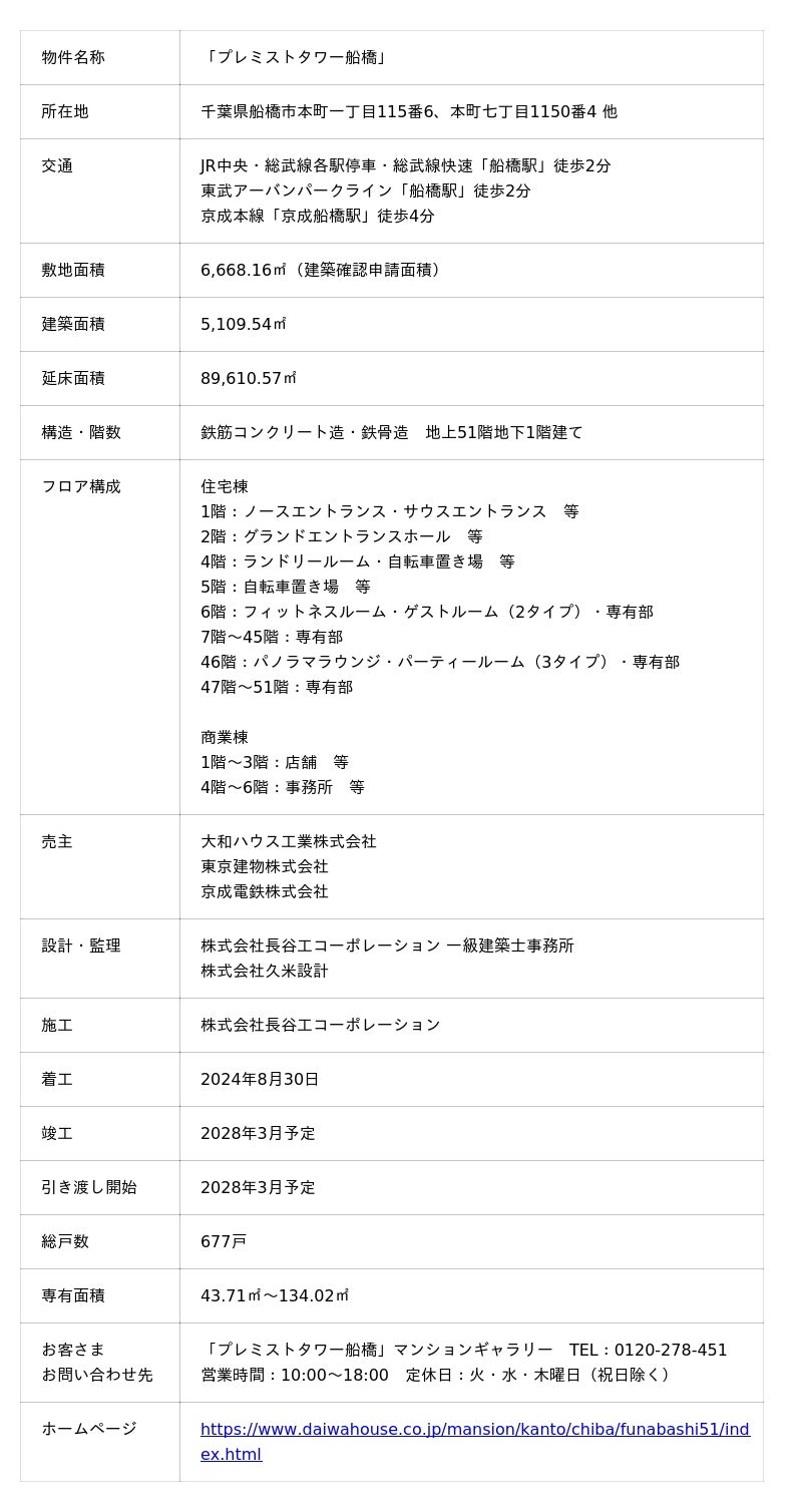 大和ハウス工業株式会社(本社:大阪府大阪市、社長:大友 浩嗣)と東京建物株式会社(本社:東京都中央区、社長:小澤 克人)、京成電鉄株式会社(本社:千葉県市川市、社長:天野 貴夫)は、千葉県船橋市の「西武船橋店本館」跡地において、2026年2月7日より、分譲マンション「プレミストタワー船橋」(地上51階・地下1階建て、総戸数677戸)の販売を開始します。