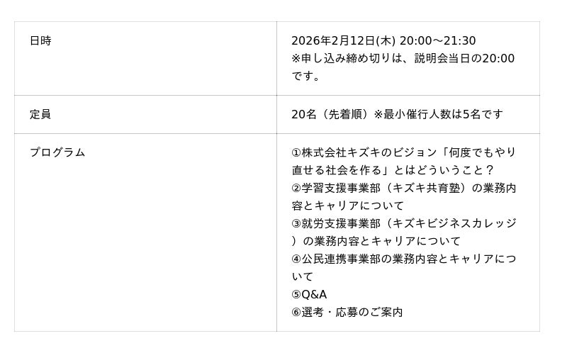 ▶︎ 株式会社キズキ 採用説明会担当:service@kizuki.or.jp