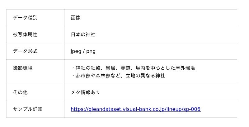 Visual Bank株式会社(東京都港区、代表取締役CEO 永井真之)は、傘下の株式会社アマナイメージズを通じて展開するAI学習用データソリューション「Qlean Dataset(キュリンデータセット)」において、画像認識、画像分類、マルチモーダルAIなどのAI開発・研究用途に向けた「日本の神社の画像データセット」の提供を開始しました。