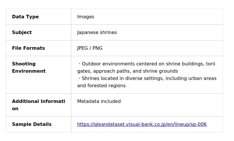 The Japanese Shrine Image Dataset is part of Qlean Dataset’s original lineup, AI Data Recipe, and is cleared for both research and commercial AI use. Through datasets grounded in cultural and social contexts, Visual Bank supports practical development and evaluation in real-world AI applications.