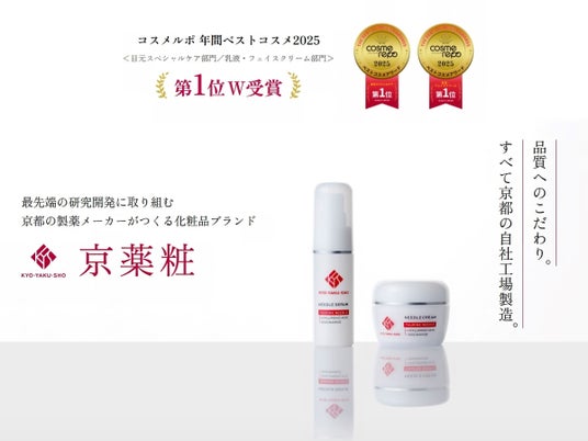 「京都から世界へ、革新的なスキンケア技術を届けたい」という想いをブランド名に込めた『京薬粧』は、日本国内ではバラエティストア、ドラッグストアなどの店舗で展開。2025年12月には美容口コミメディア「コスメルポ」にて『京薬粧』がユーザーから高く評価され「年間ベストコスメ2025」※3に選出されています。