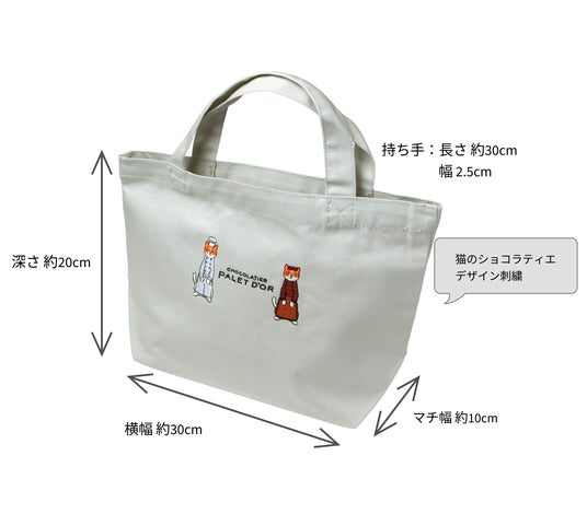 トートバッグ(小)は、5個入りのショコラBOXが入るサイズで、キャラクター部分は高級感のある刺繍仕上げで作っています。焼菓子やドリップコーヒーバッグとセットしてギフトにしたり、自分用のランチバッグにもおすすめです。