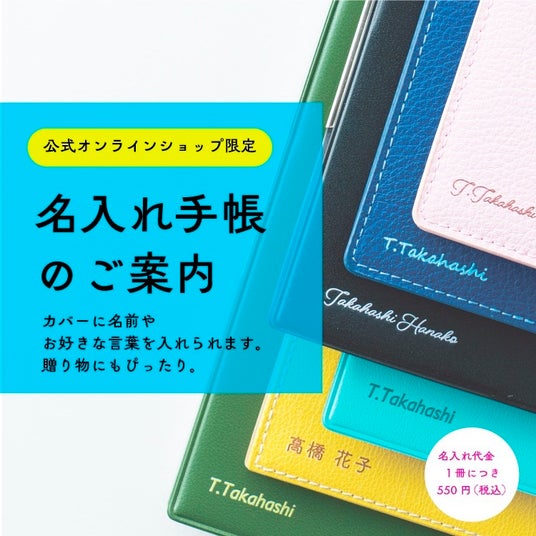 また、カバーへの名入れを1冊550円(税込)にて承ります。名前や好きな言葉を入れて、オリジナルの手帳を作ってみても。