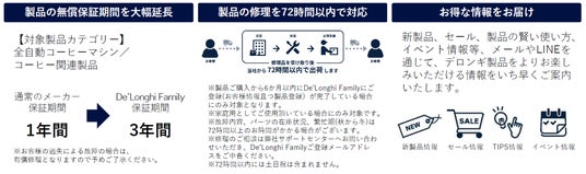 デロンギ製品をご購入いただいたお客様に、安心して製品を長くご愛用いただくため、ご購入後のメーカー無償保証期間の延長、万が一の際の迅速な修理対応といったアフターケアを大幅に拡大し提供いたします。また、メンバー限定の先行情報として、新商品やセールなどの最新情報もいち早くお届けいたします。