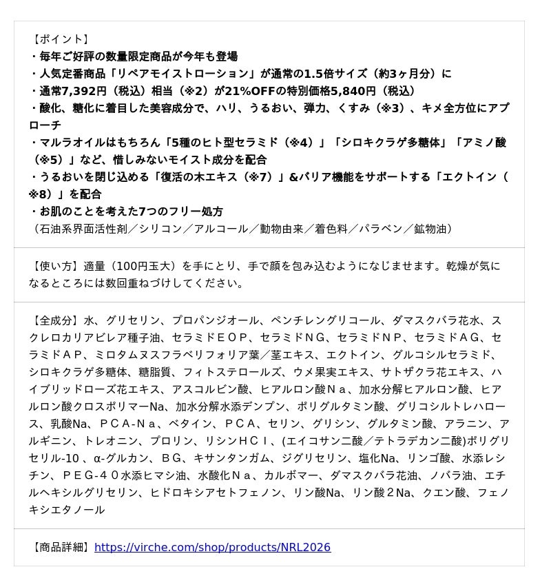 株式会社ヴァーチェ(本社:大阪府大阪市、代表取締役:藤原友香)が展開するエイジングケア(※1)ブランド「VIRCHE(ヴァーチェ)」は、2026年2月10日(火)より、毎年大人気の商品「リペアモイストローション ラージサイズ」を数量限定で発売します。