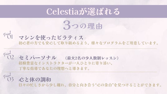 マシンピラティスを始めたい方、姿勢改善や痩せやすい身体を手に入れたい方、ぜひCelestiaでピラティスの楽しさを体験してください。お待ちしております!