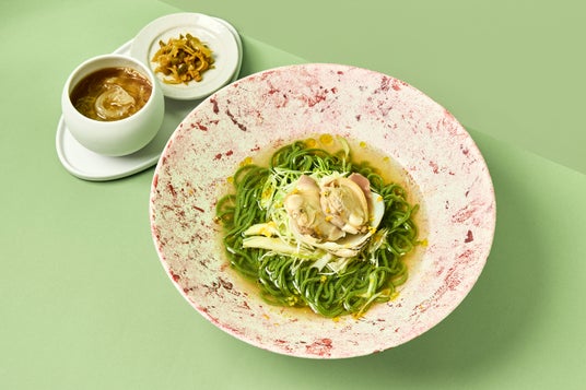 ふかひれ家淡路島産わかめを練り込んだ冷たい翡翠麺は、わかめ由来のとろみと独特のなめらかさが特徴。はまぐりベースの塩味スープに山椒とゆずが香り、具材には、はまぐりやうるいなど春食材を使用。まずはそのままの風味を楽しみ、途中でふかひれスープを加えて味の変化も堪能できます。