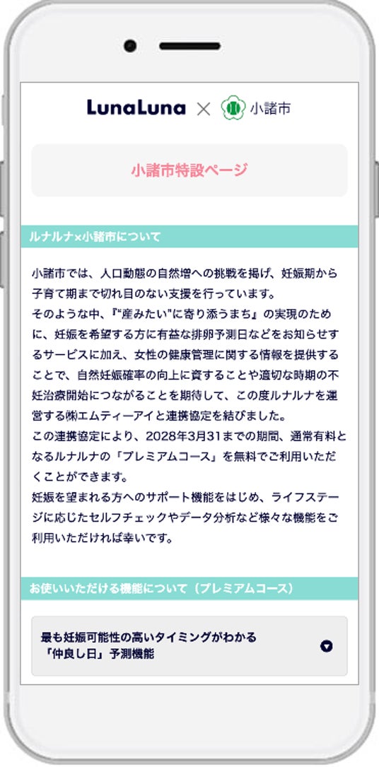 本連携協定により、小諸市の住民に対し、当社が提供する、すべての女性の一生に寄り添うウィメンズヘルスケアサービス『ルナルナ』の有料機能である「プレミアムコース」の無償提供を4月1日(水)より開始します。『ルナルナ』のサービスを通じて、不妊治療や妊活に関する基礎知識などの情報配信も予定しており、利用者はライフステージに合わせた健康情報を受け取ることができます。