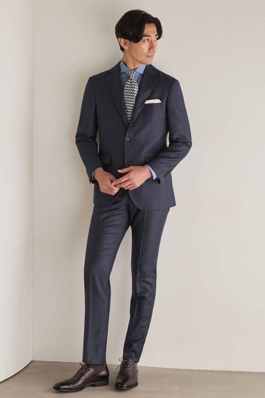 国産ウール100%でありながら、スラックスはウエストストレッチ仕様で4cm程自然にウエストが伸びるため、高級感のあるエレガントな印象と快適な着心地を両立しています。ドレスシャツにタイドアップでカッチリとした着こなしができ、カットソーやニットでビジカジライクなスタイルでもサマになります。