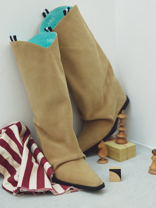 佐田氏はMANA展示会にてMANAのブーツシリーズに一目惚れし、今回のコラボレーションの2型が誕生しました。1型はシルエットが美しく思わず触れたくなる「スエードウエスタンブーツ」。 遊び心溢れる裏革のミントグリーンのバイカラーの配色がキャッチーなブーツ。サイドにはプレッピームードが漂うカラーテープを施したデザインとなっています。履くだけで一気に足元にボリュームが出る存在感は、コーディネートに一点投入で気分が上がるアイテムです。カジュアルな雰囲気でデニムとの相性も抜群。8cmのインヒールで佐田氏らしいプレッピー×キレイめのスタイリングに合うバランスを意識しました。