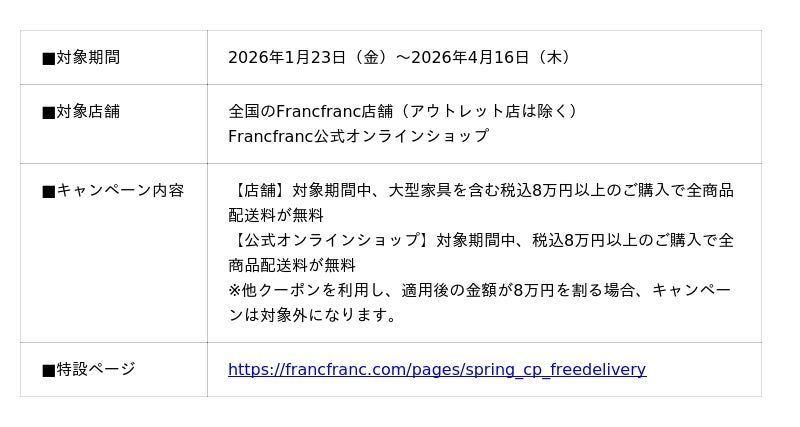 2026年1月23日(金)~2026年4月16日(木)の期間中、大型家具を含む税込8万円以上をご購入のお客様を対象に、家具や雑貨などの新生活アイテムをお得に買い揃えられる『配送料無料キャンペーン』を実施します。