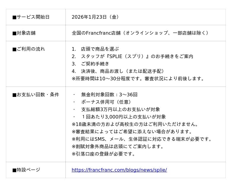 2026年1月23日(金)より、アプリ決済サービス 『SPLIE(スプリ)』を利用した分割払いサービスを開始しました。月々のお支払いにより、大型家具や複数のアイテムも無理なくご購入いただけるため、ご負担を抑えながら理想の暮らしをスムーズに始められます。お手続きは店頭スタッフがサポートするため、初めての方も安心してご利用いただけます。