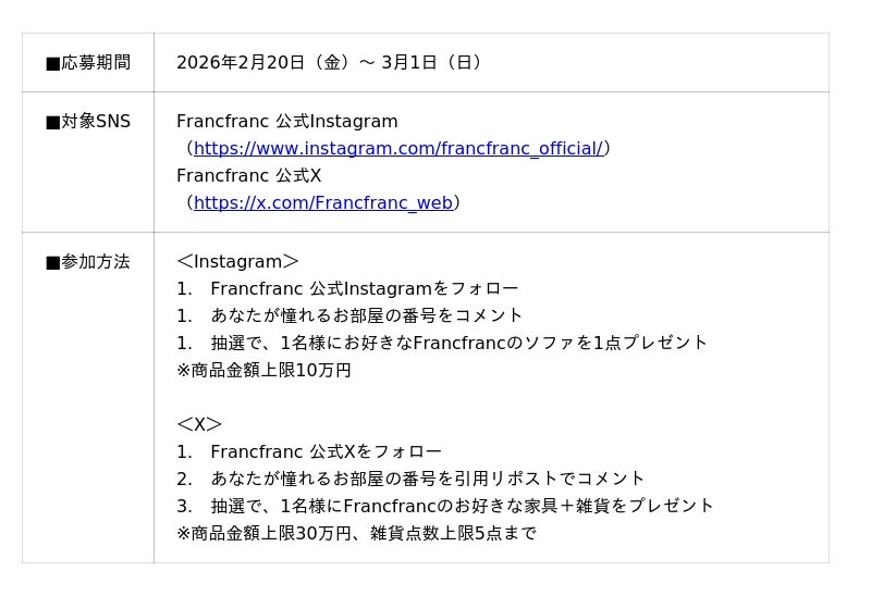2026年2月20日(金)より、公式InstagramおよびXにて、フォロー&コメントまたはリポストすることで応募できるSNS新生活キャンペーンを開催します。本キャンペーンでは、インテリアコーディネーターの資格を有する『Francfranc Interior Stylist(通称FIS)』が監修した、6種類の異なるテイストのお部屋コーディネートを公開。参加者はその中から「憧れのお部屋」を選び、各SNSでコメントまたはリポストすることで応募が完了します。キャンペーンにご参加いただいた方の中から抽選で、InstagramおよびXそれぞれ1名様に、新生活を彩る素敵なアイテムをプレゼントします。