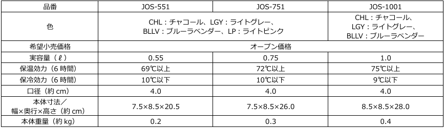 『真空断熱ケータイマグ(JOS-551/751/1001)』 仕様一覧