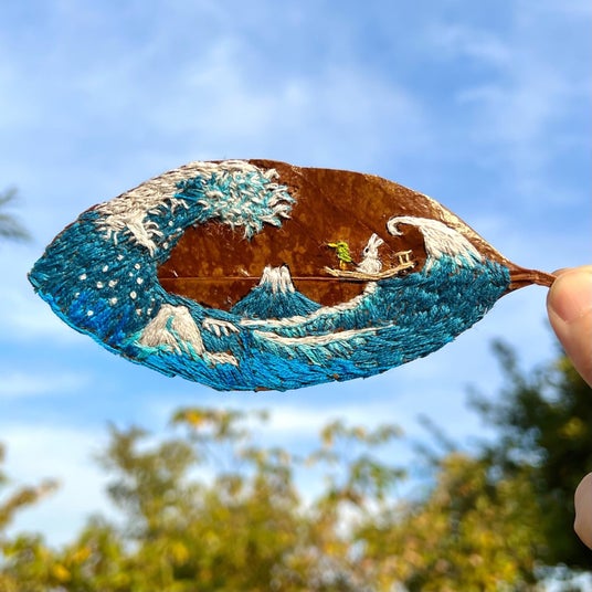 専業主婦として過ごすなかで、心の不調を抱えた時期も。そんな母を支えたいと願った息子の勧めで、2019年よりInstagram投稿を始める。紙粘土作品や色鉛筆画などを経て、息子と同じ「葉っぱ」を舞台にした刺繍の世界へ。SNSでの発信と日々の積み重ねを通じ、現在は独自の表現スタイルを確立している。