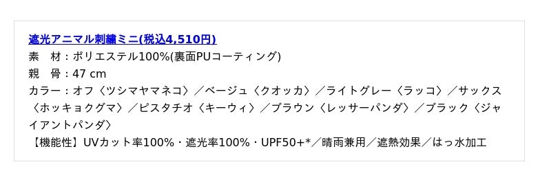 ※記載の結果は生地の状態での測定値であり、傘本体の性能を示す数値ではございません。また、生地に施された刺繍・縫製などのUV加工生地以外の部分もこの限りではございません。