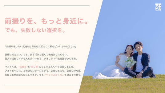 『マエドル』は、「前撮りをしたいけれど、どこに頼めばいいかわからない」「大手スタジオは高額、フリーランスは進行や品質が不安」といった、多くのカップルが抱える悩みに向き合うために生まれたブランドです。