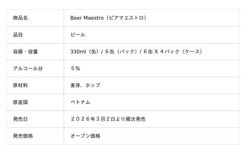 当社ではこれまでに、韓国大手ビールメーカーとの業務提携により「プライムドラフト」(旧・第三のビール)を2005 年より製造および販売をしています。今回の新製品「Beer Maestro(ビアマエストロ)」は世界有数のビール消費国であるベトナムの大手ビール工場と協力し、高度な醸造技術による、ラガー特有のキレのある爽快感と、2 種類のアロマホップによる程よい香りを実現したビールが完成しました。