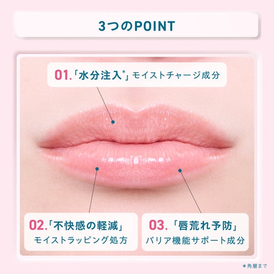 唇にぴったりと密着する油性成分の中に水分を閉じ込める「モイストラッピング処方」を採用。唇になじませると表面に薄いバリア膜を形成し、与えた水分を長時間キープしながら、外的な刺激による負担からも唇を守ります。その結果、カサカサなどの不快感を感じにくくなり、口紅などによる負担も軽減できます。