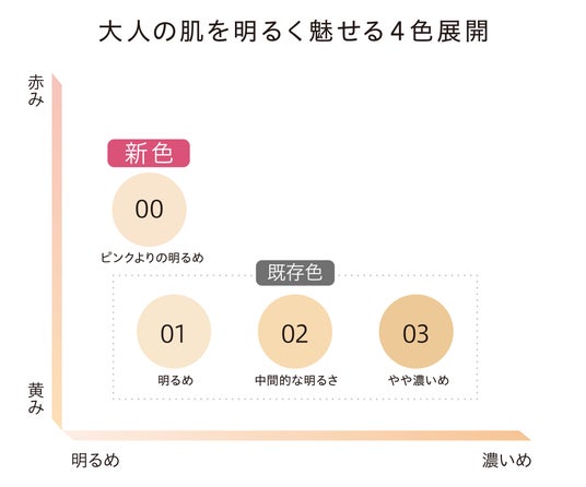 そのため明るい色の中でも、肌の赤み/黄みどちらの悩みにも応えられるようなカラーバリエーションが必要であると考え、明るめピンクオークルカラーを選定いたしました。