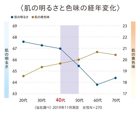 20代から70代の女性を対象に肌の明るさと色味を測定したところ、40代を境に肌の明るさは暗くなり、黄みが増していることが分かりました。