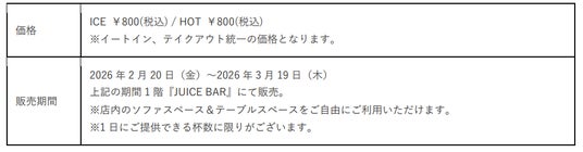 桜をテーマに期間限定のオリジナルドリンクを 1 階『JUICE BAR』にて販売いたします。 2/20(金)~3/19(木)の第一弾では、チェリーの香りが漂うフルーティーな茶葉をオーツミ ルクで煮出し、桜あんと合わせた桜あんと合わせたほんのりと桜が香るコクのあるミルクティーに仕上げまし た。トッピングには桜の形をしたクリームを添えて、春の訪れが待ち遠しくなるようなアイス・ホットの 2 種をご用意しております。春の訪れが待ち遠しくなるアイス・ホットの 2 種をご用意しております。